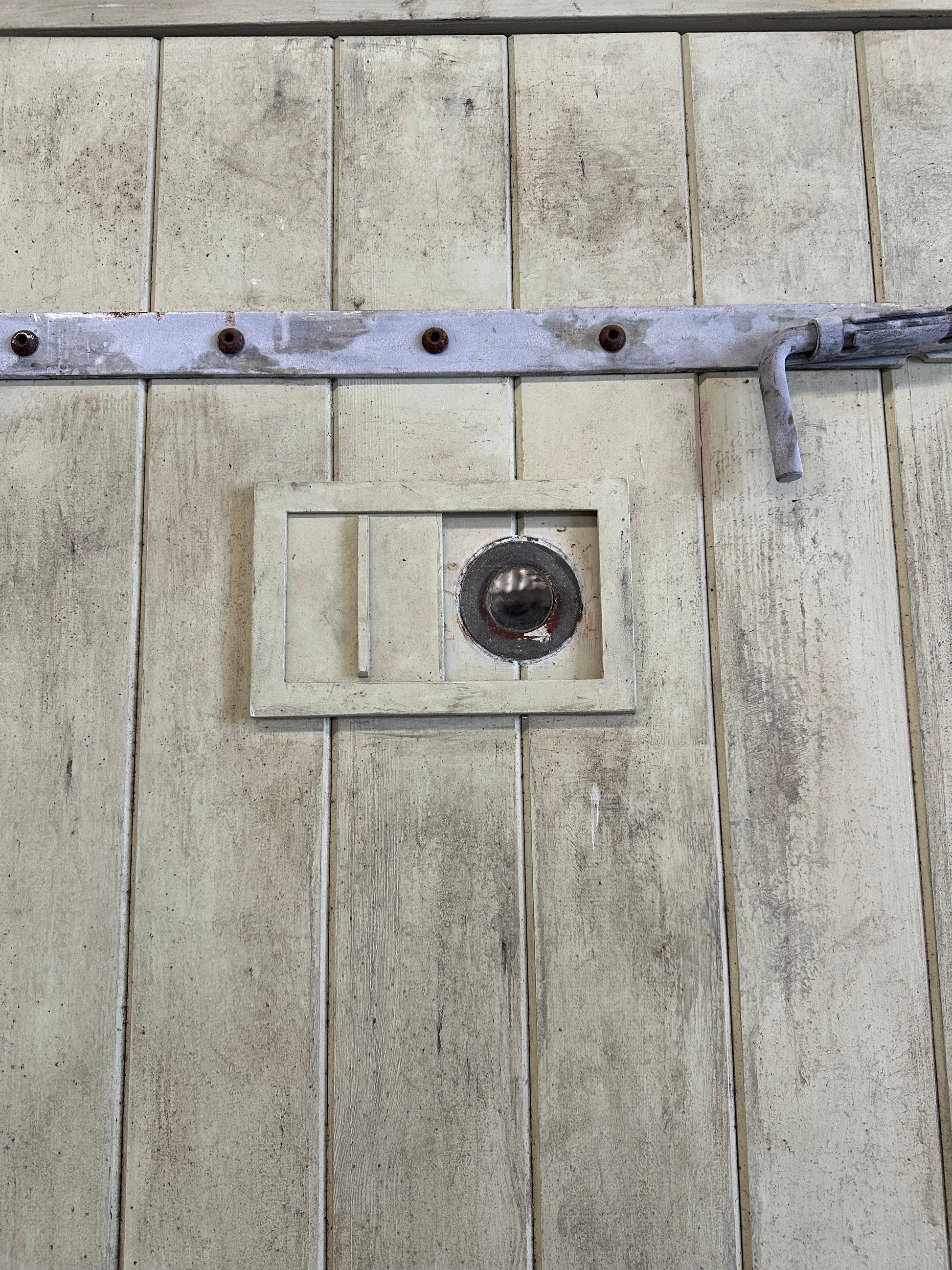 Porte en bois avec oeil de boeuf et deux verrous à coulisse.