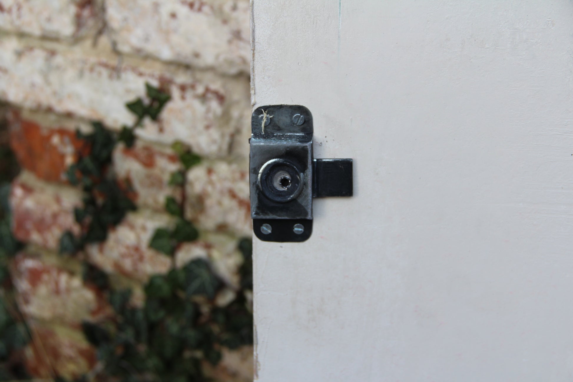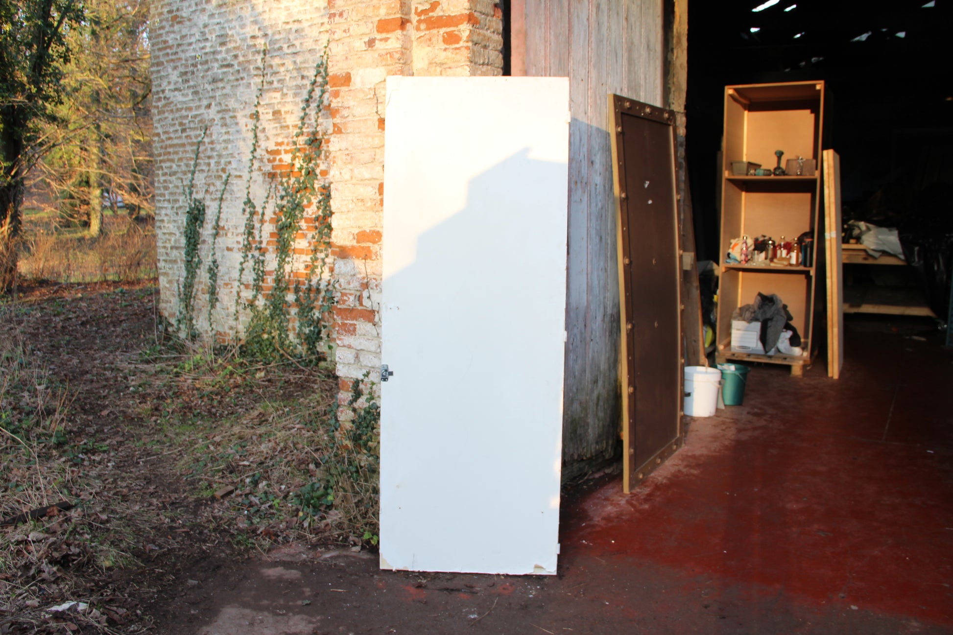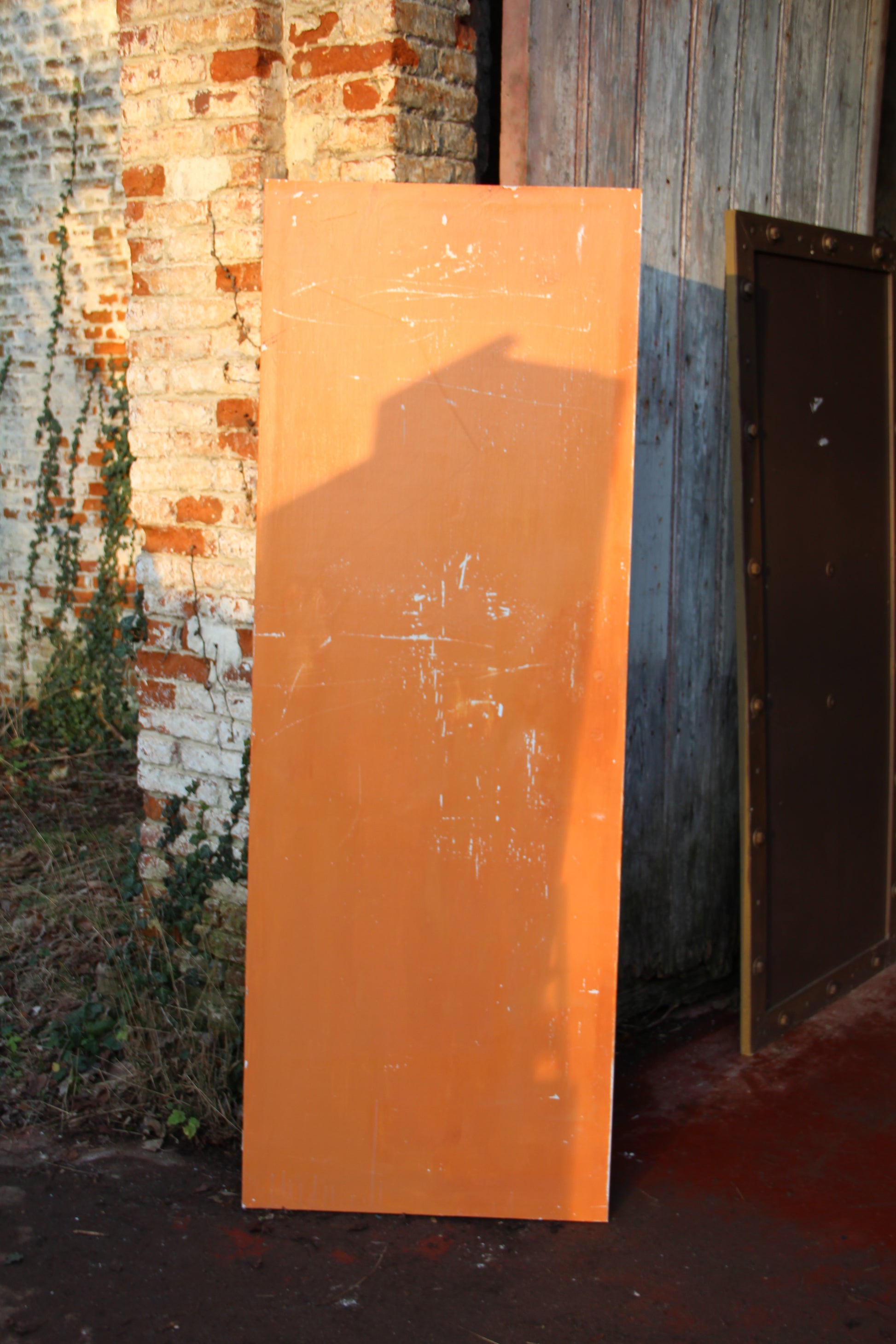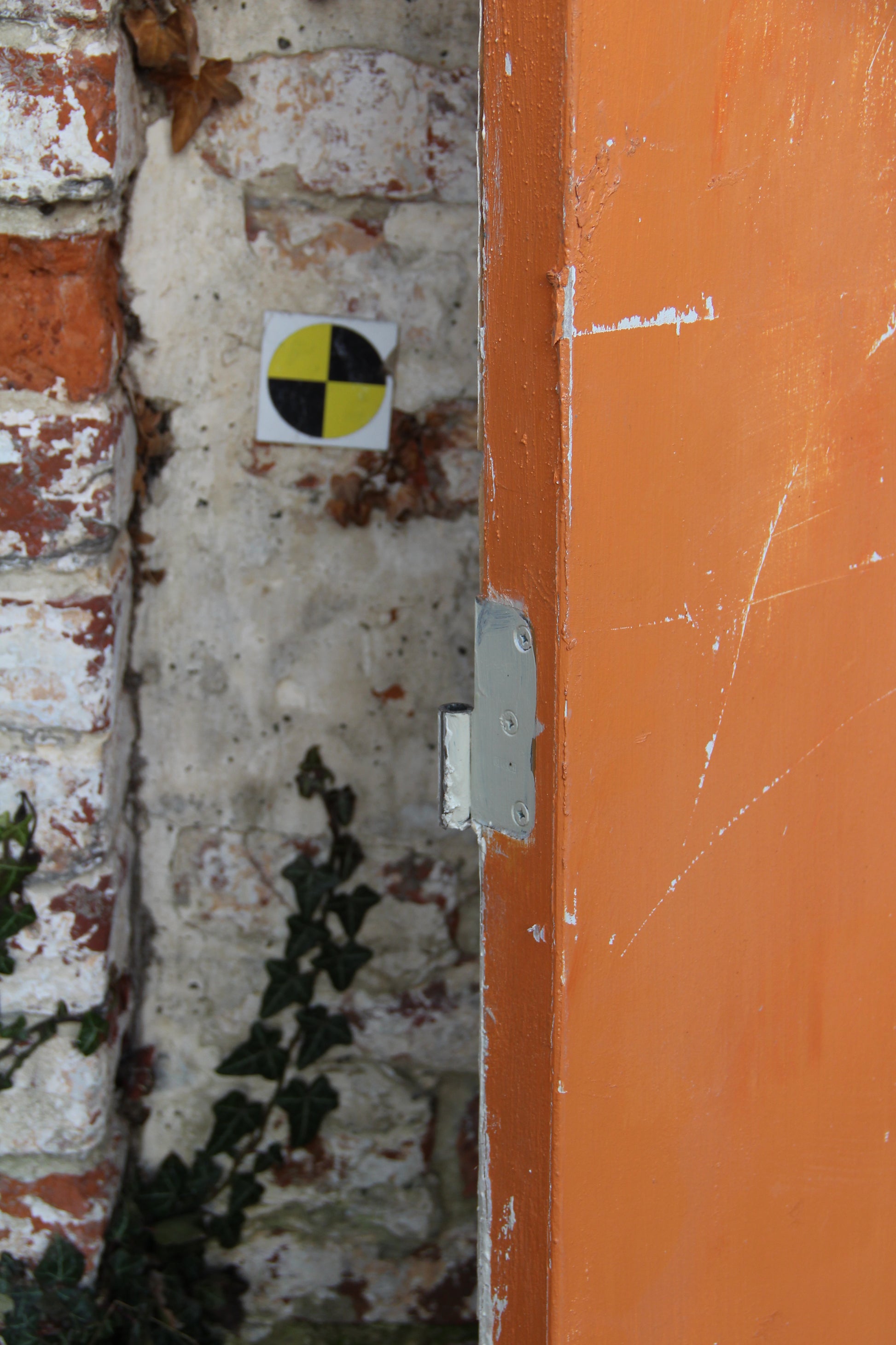 Porte orange et une face blanche sans poignée et avec un verrou